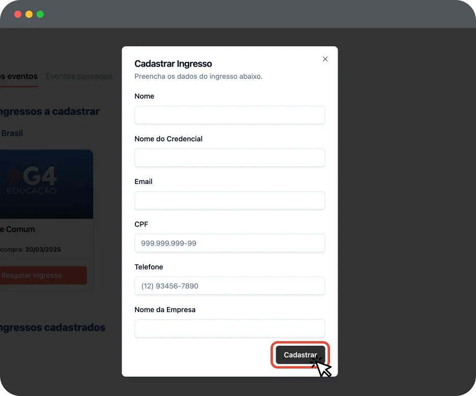 Clique em 'Resgatar Ingresso' e preencha todos os dados para emitir o ingresso.